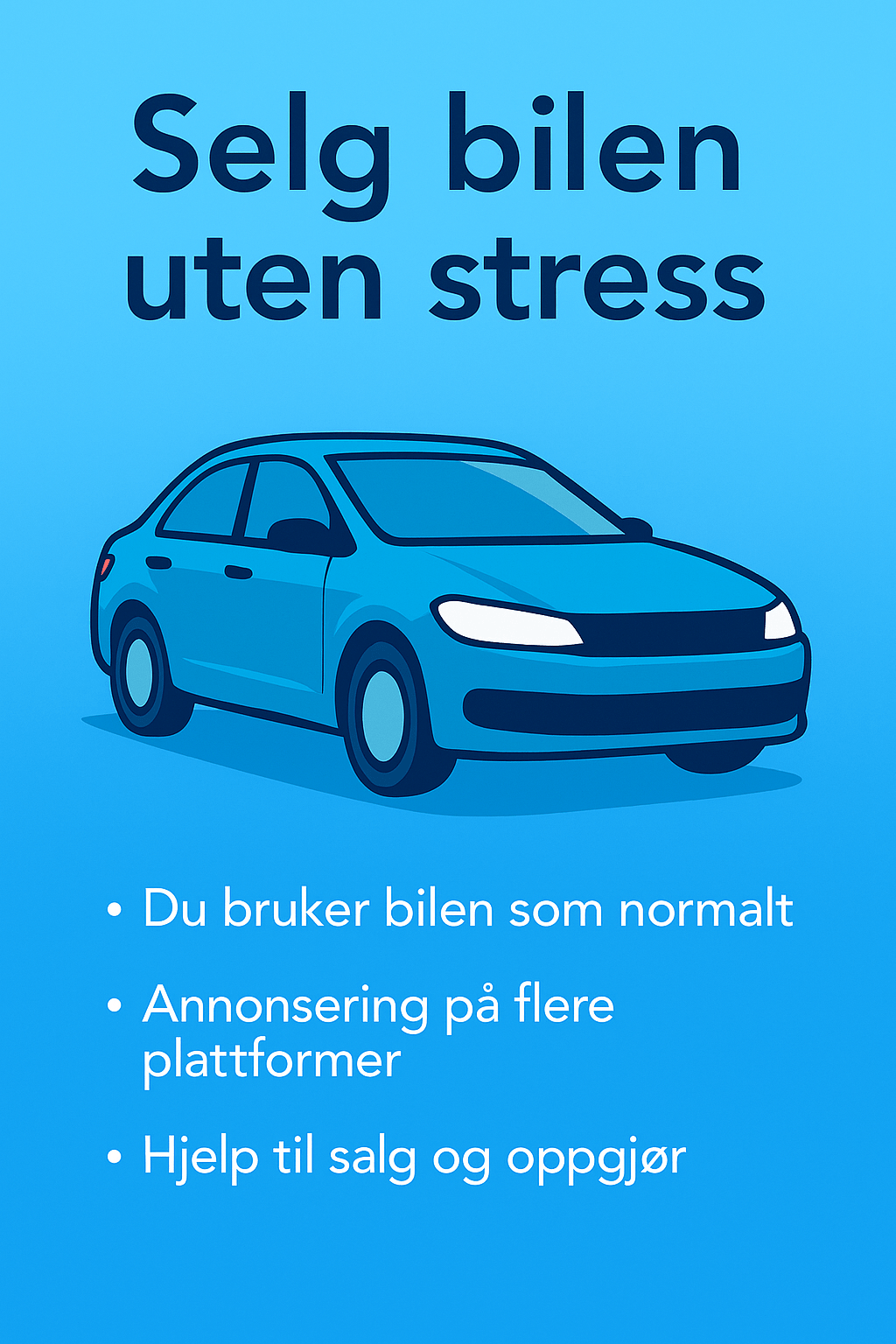 Selg bil eller campingbil uten stress. Vi håndterer annonsering, kundehenvendelser, bud, kontrakt og sikkert oppgjør – du bruker kjøretøyet som normalt.